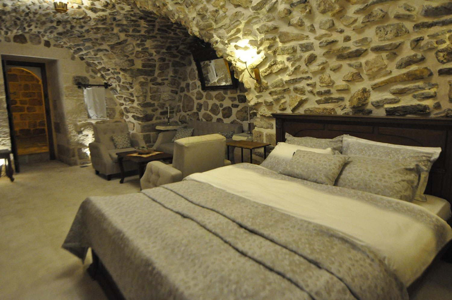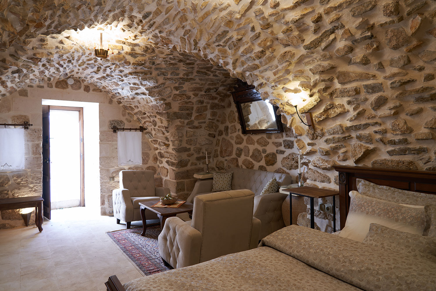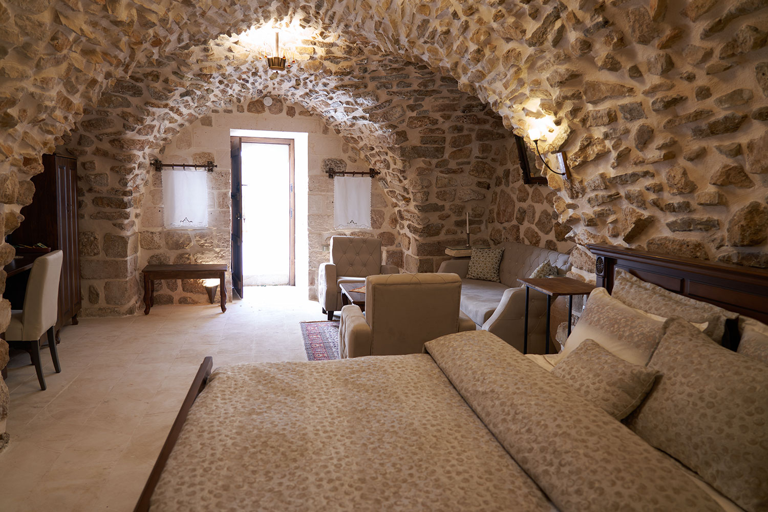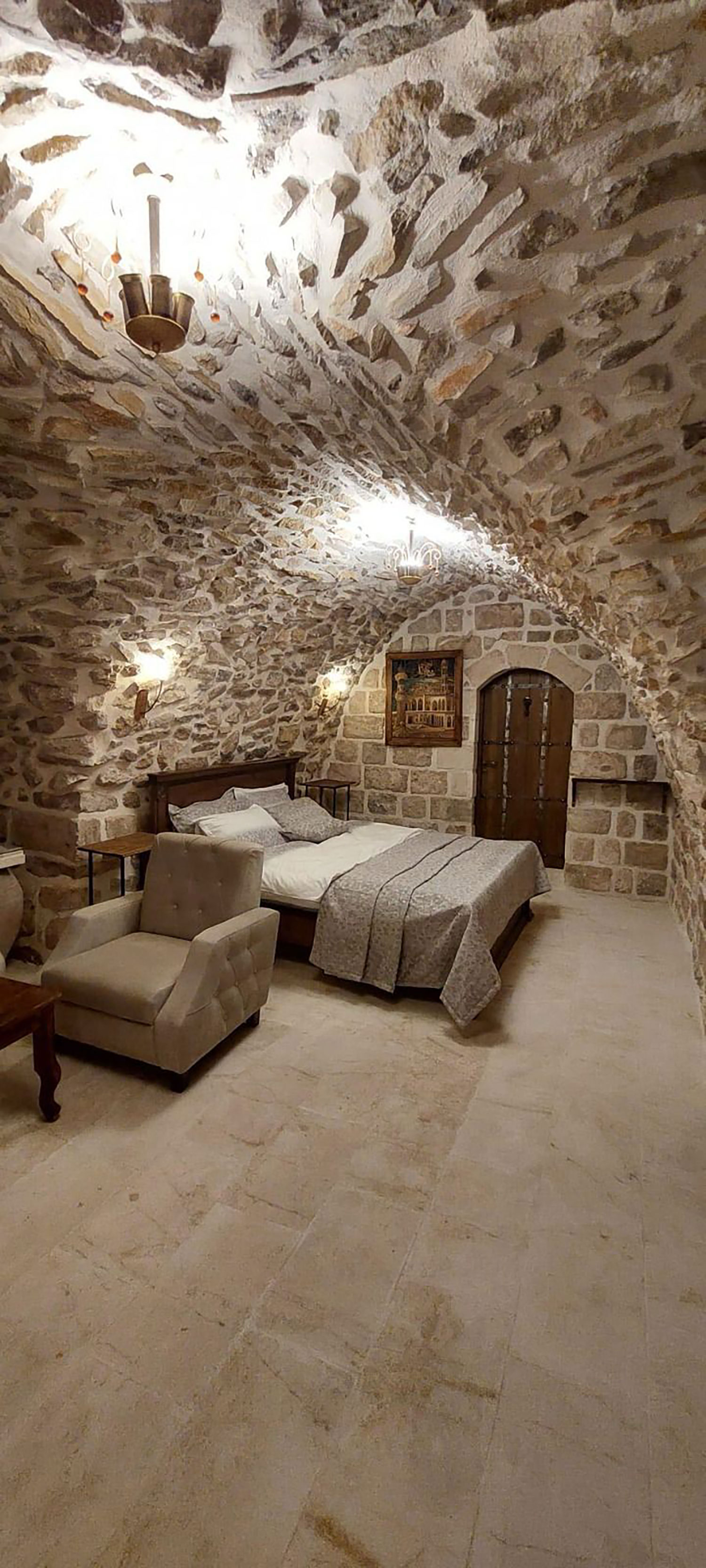 Ceviz kapılar ve tokmaklar, taş duvarlar ve odanın dekoru ile birleşerek eşsiz bir atmosfer yaratır. İçeri adım attığınızda taşların sessiz fısıltısı sizi tarihin içine taşır.