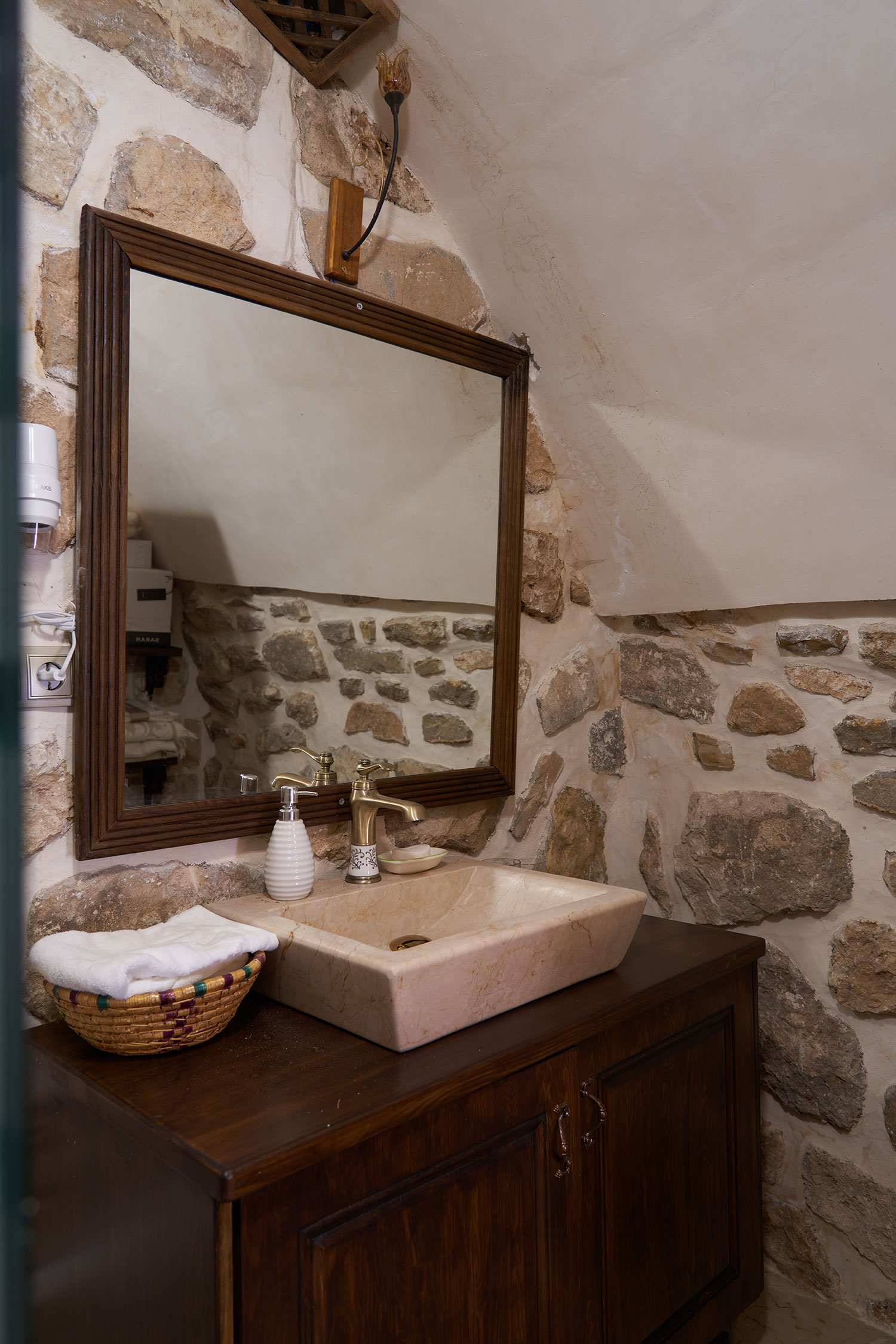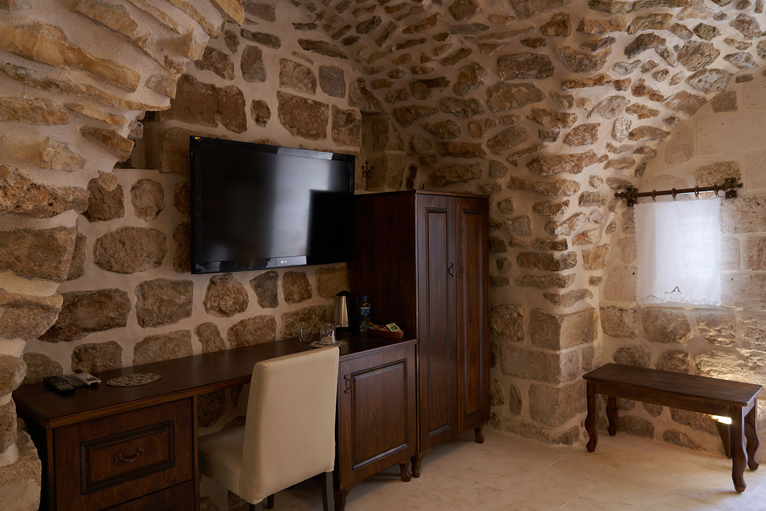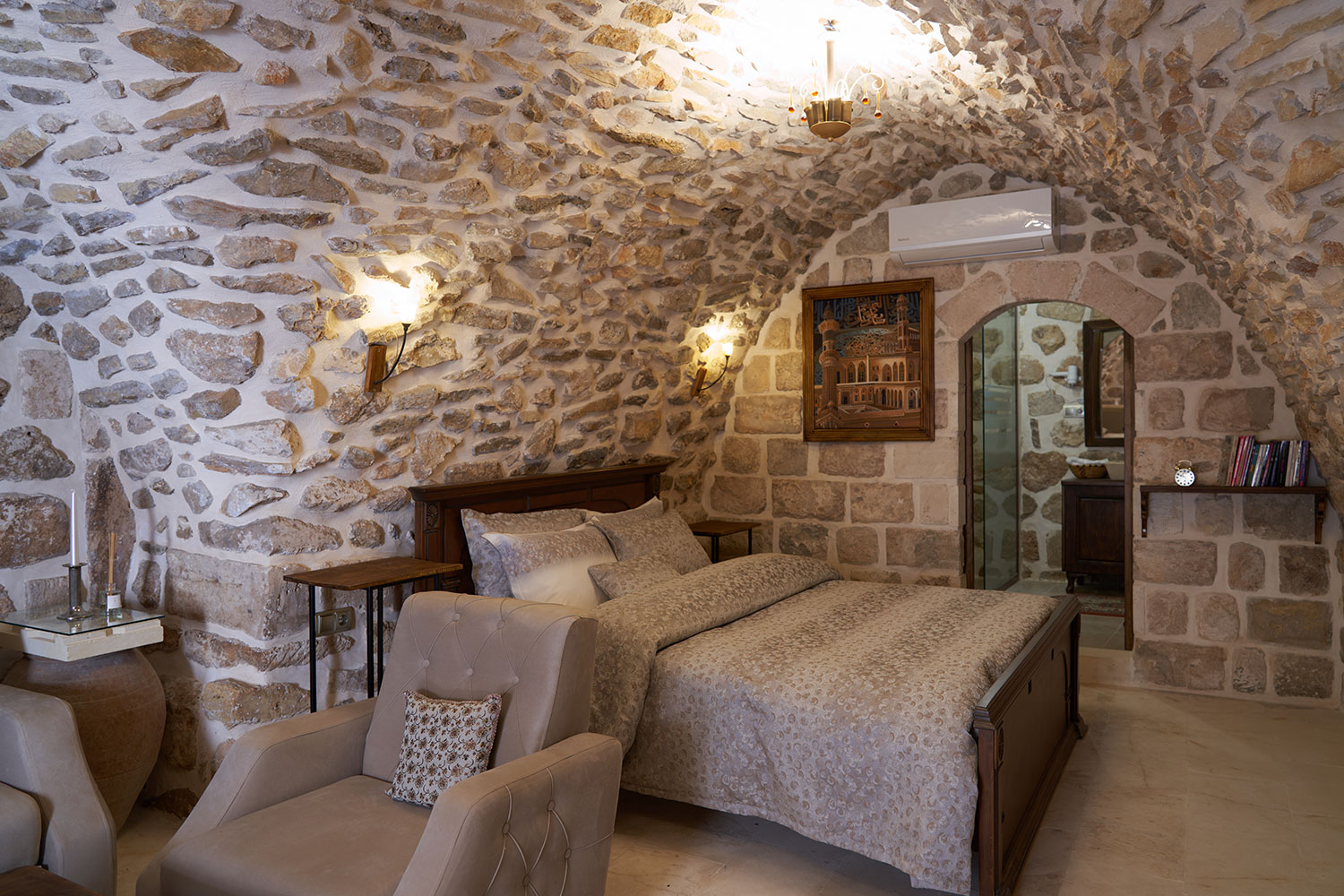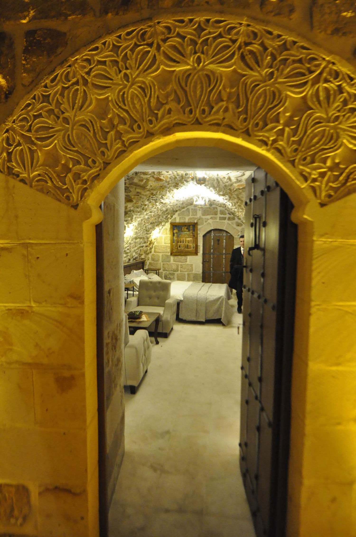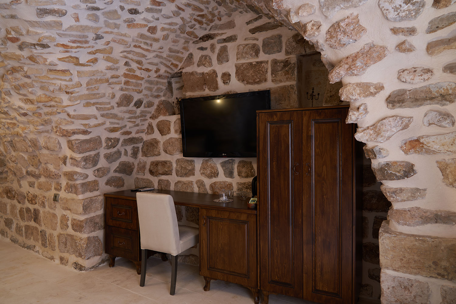 Ceviz kapılar ve tokmaklar, taş duvarlar ve odanın dekoru ile birleşerek eşsiz bir atmosfer yaratır. İçeri adım attığınızda taşların sessiz fısıltısı sizi tarihin içine taşır.